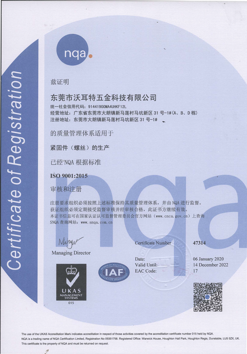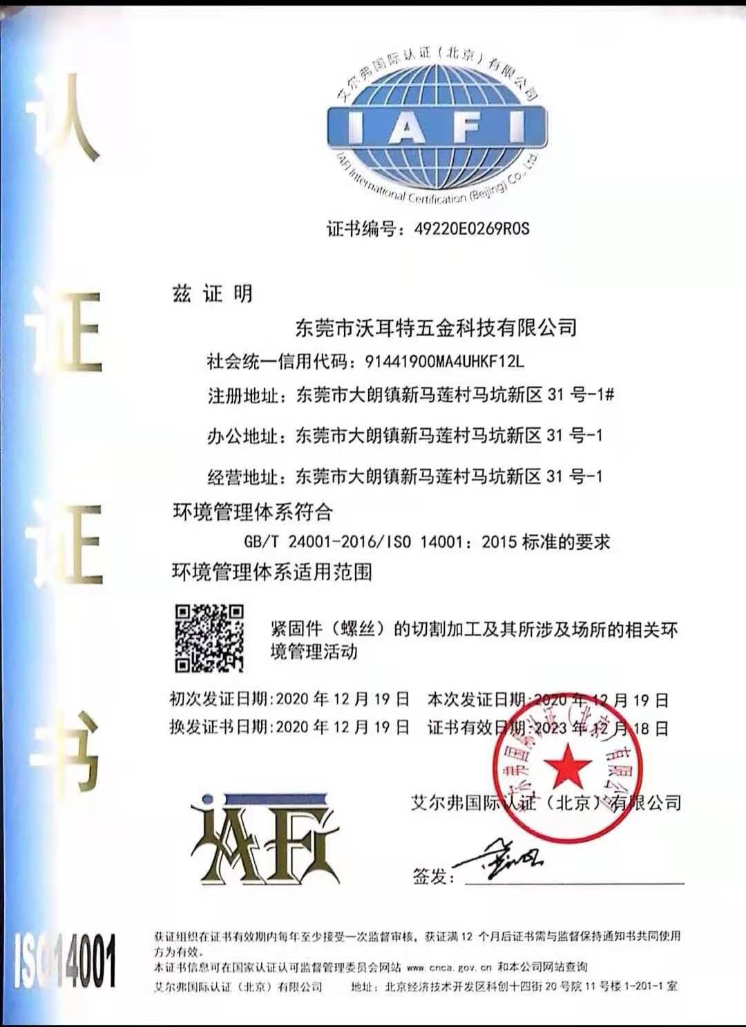 东莞市沃耳特五金科技有限公司成立于2015,是集开发、设计、生产销售、服务于一体的生产型企业。专业生产螺丝、螺母、CNC零部件及各类精密紧固件,目前公司已经通过IATF 16949ISO9001ISO14001等体系认证。